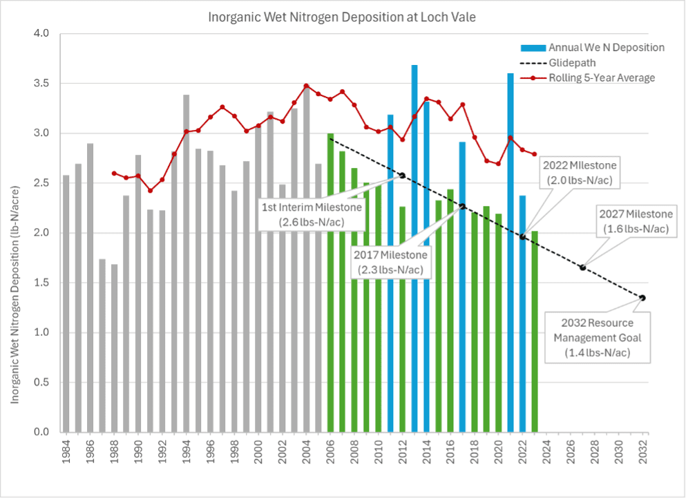 Wet nitrogen deposition at Loch Vale in Rocky Mountain National Park. The “Glidepath” represents target deposition rates to reduce deposition to the resource management goal of 1.4 lbs-N/acre per year by 2032. Green bars indicate deposition values since adoption of the Nitrogen Deposition Reduction Plan that are at or below the Glidepath. Blue bars are years with above average precipitation, which results in higher wet deposition.